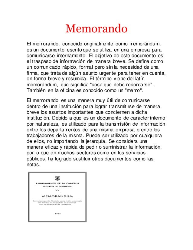 Un memorándum término proveniente del latín que en español admite la expresión memorando es un escrito que en general circula en el ámbito de las oficinas y demás contextos laborales a través del cual se informa acerca de algo o se da alguna instrucción concreta a los miembros de la organización. No obstante es importante señalar que este tipo de término también se utiliza en ocasiones para referirse a intercambios de información entre organismos del estado o incluso entre estados mismos. Al memorando empresarial también se le conoce en el ambiente laboral como memorándum memoranda o memo.Gratuit El Memorandum Ejemplos Gen5o9pp8elo
